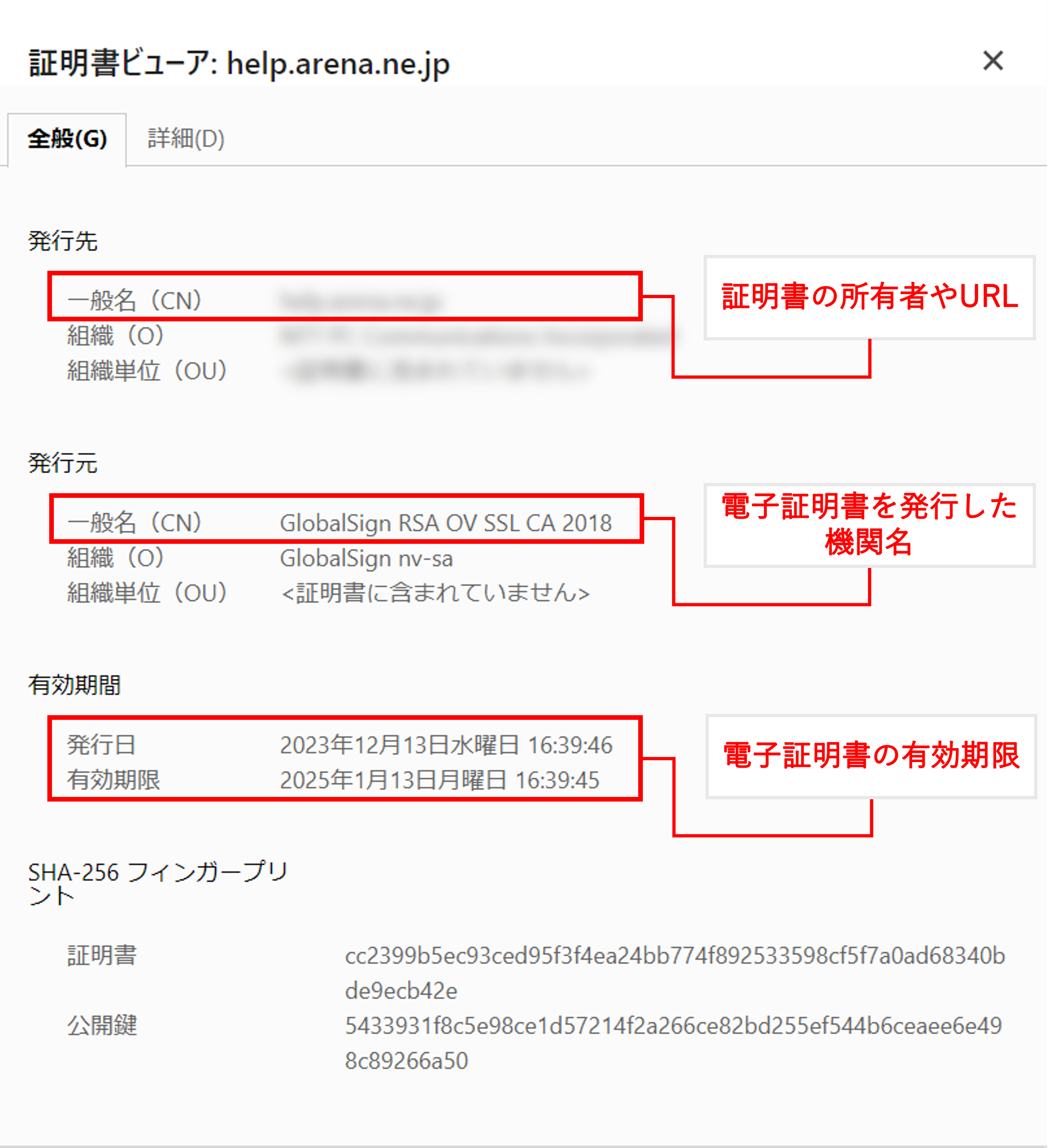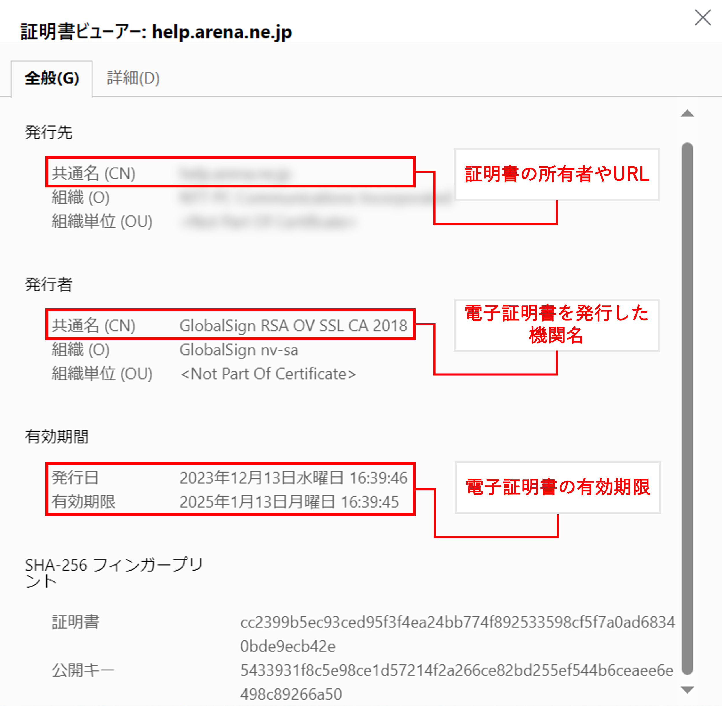 - 「証明書ビューア」というダイアロボックスが表示されます。こちらに証明書情報が記載されています。