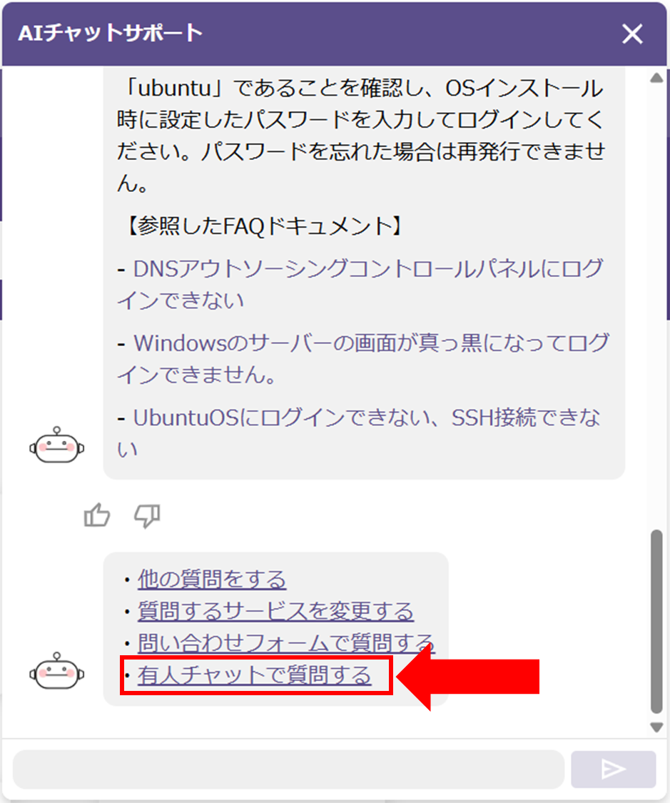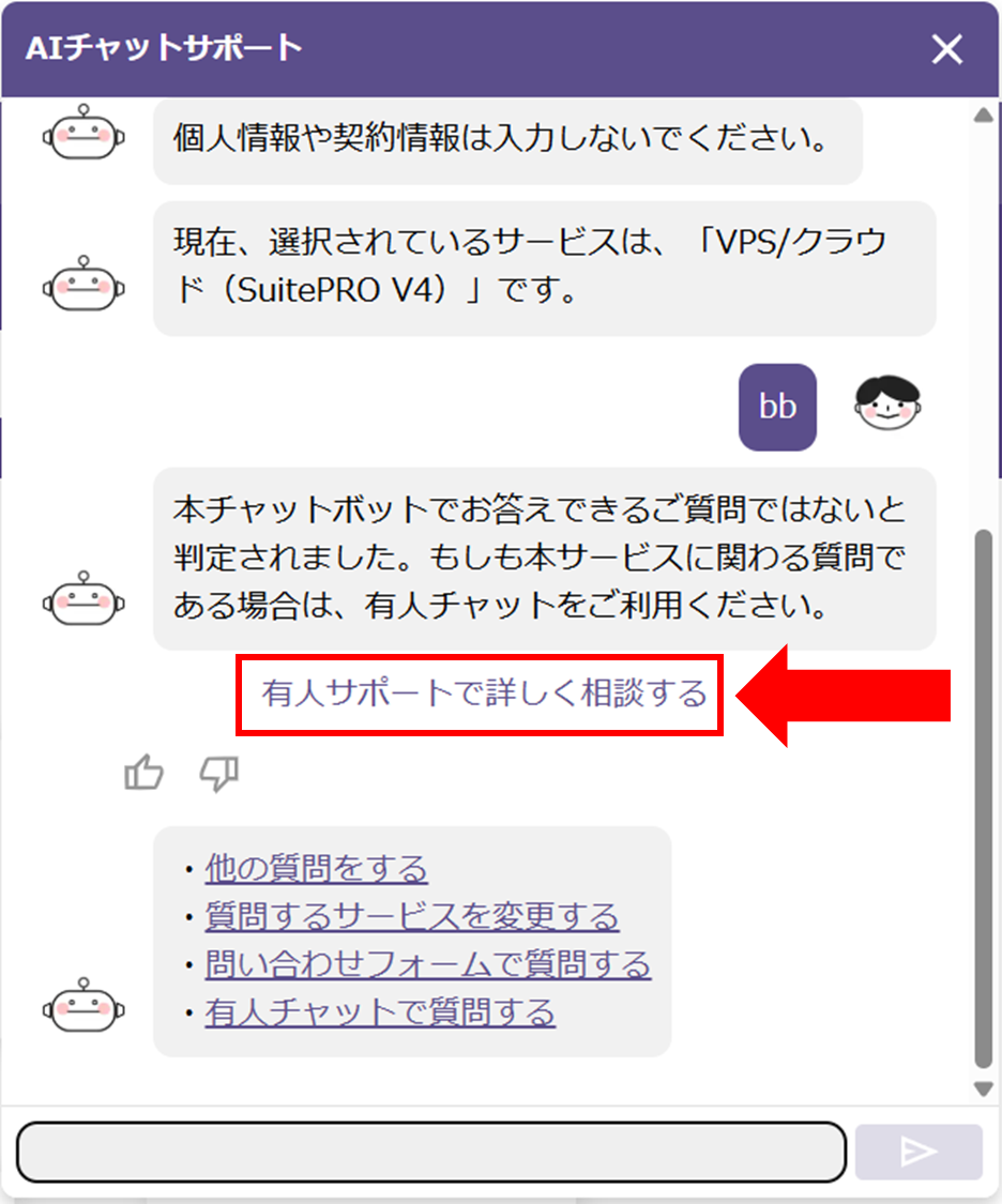 ※AIによる回答が「お答えできるご質問ではない」と判定された場合、回答文の下に「有人サポートで詳しく相談する」と表示されますが、こちらをご選択いただいた場合も、次の手順へ進むことができます。