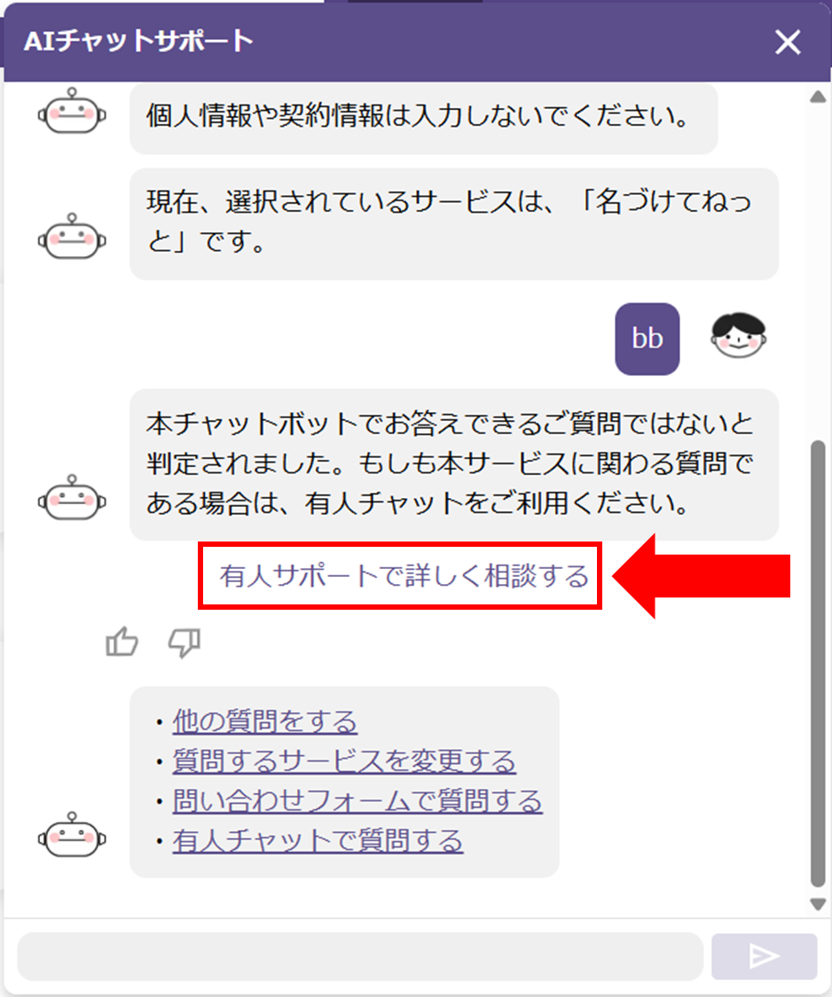 ※AIによる回答が「お答えできるご質問ではない」と判定された場合、回答文の下に「有人サポートで詳しく相談する」と表示されますが、こちらをご選択いただいた場合も、次の手順へ進むことができます。