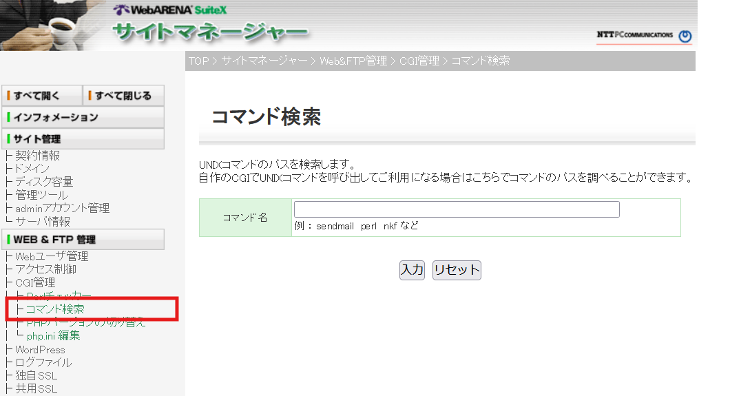 sendmail のパスを教えてください。(SuiteX V1/V2) 辻本 2025年07月24日 08:20 更新 フォローする sendmailのパスは、サイトマネージャーにログインし、 メニューの WEB&FTP管理 > CGI管理 > コマンド検索 にてご確認ください。