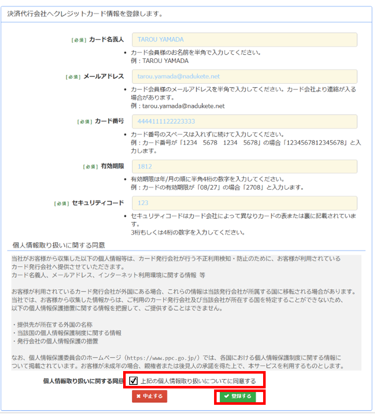 - 情報入力画面が新規に表示されるので、カード情報を入力し、個人情報取り扱いに関する同意をご確認いただきチェックボックスにチェックを入れ、「登録する」ボタンをクリック。